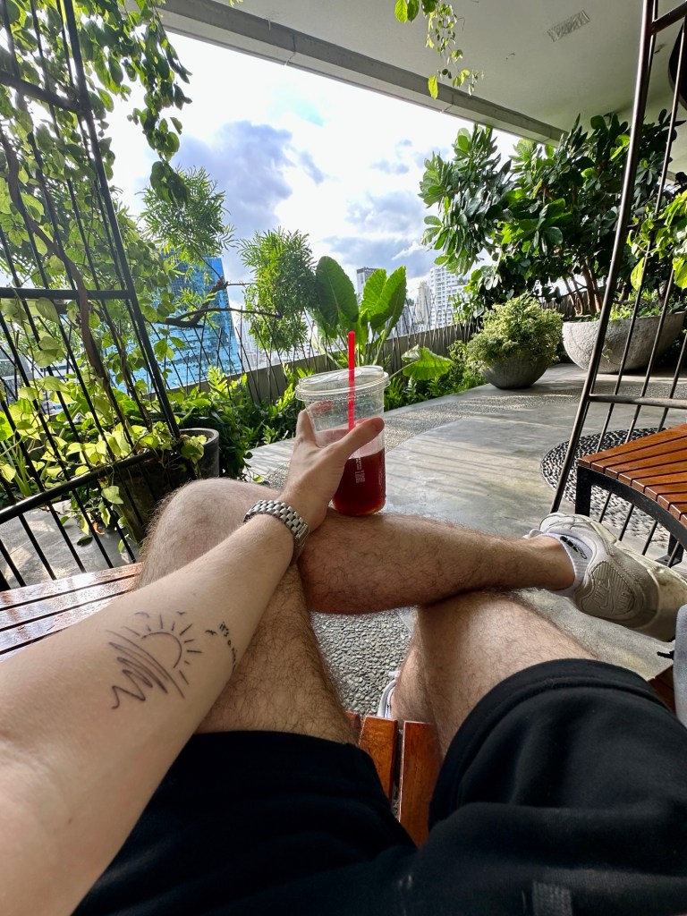 My own crude handwriting, a couple of birds and little sunset drawn onto my forearm, reminding me that it’s a nice day.